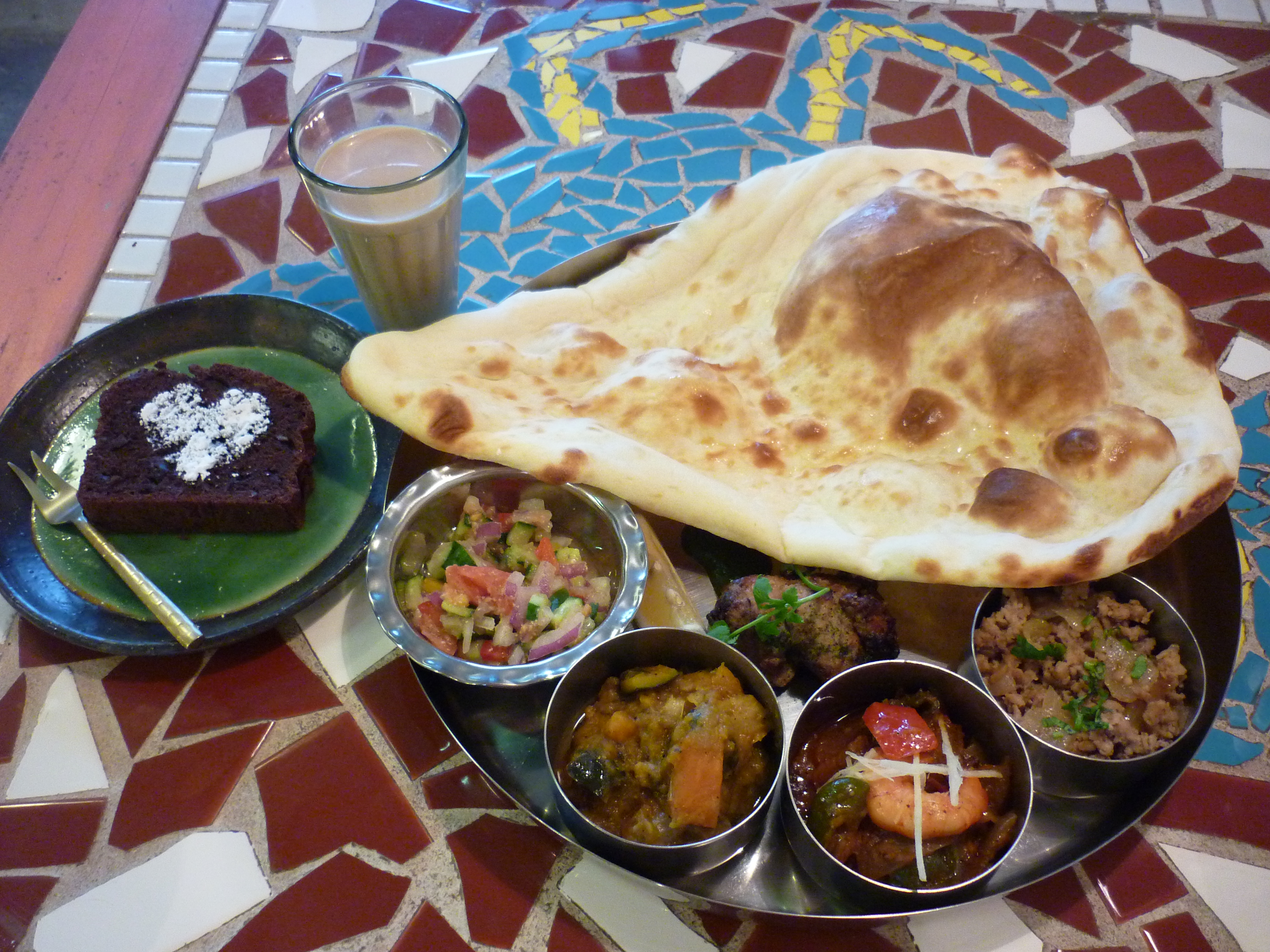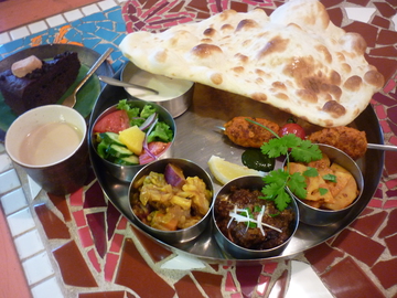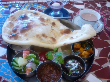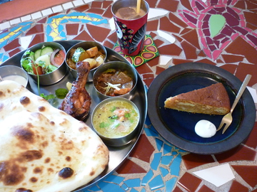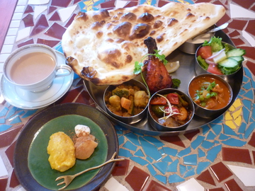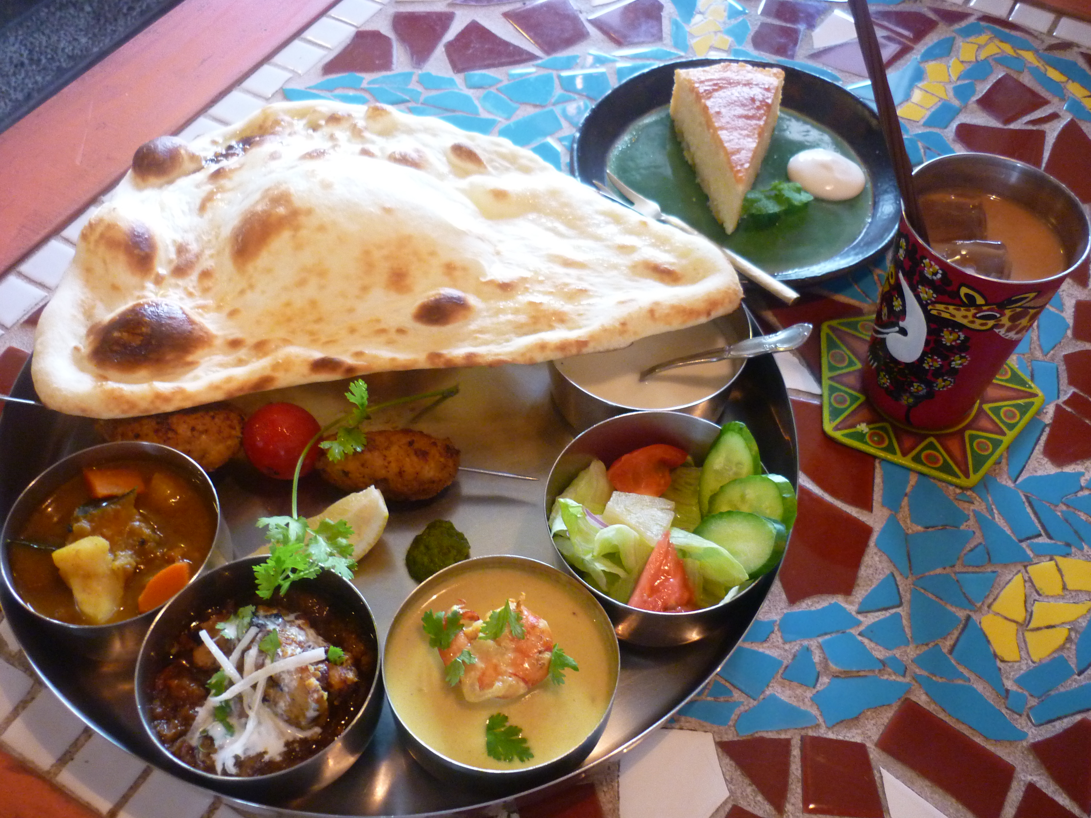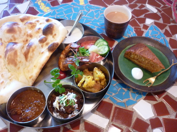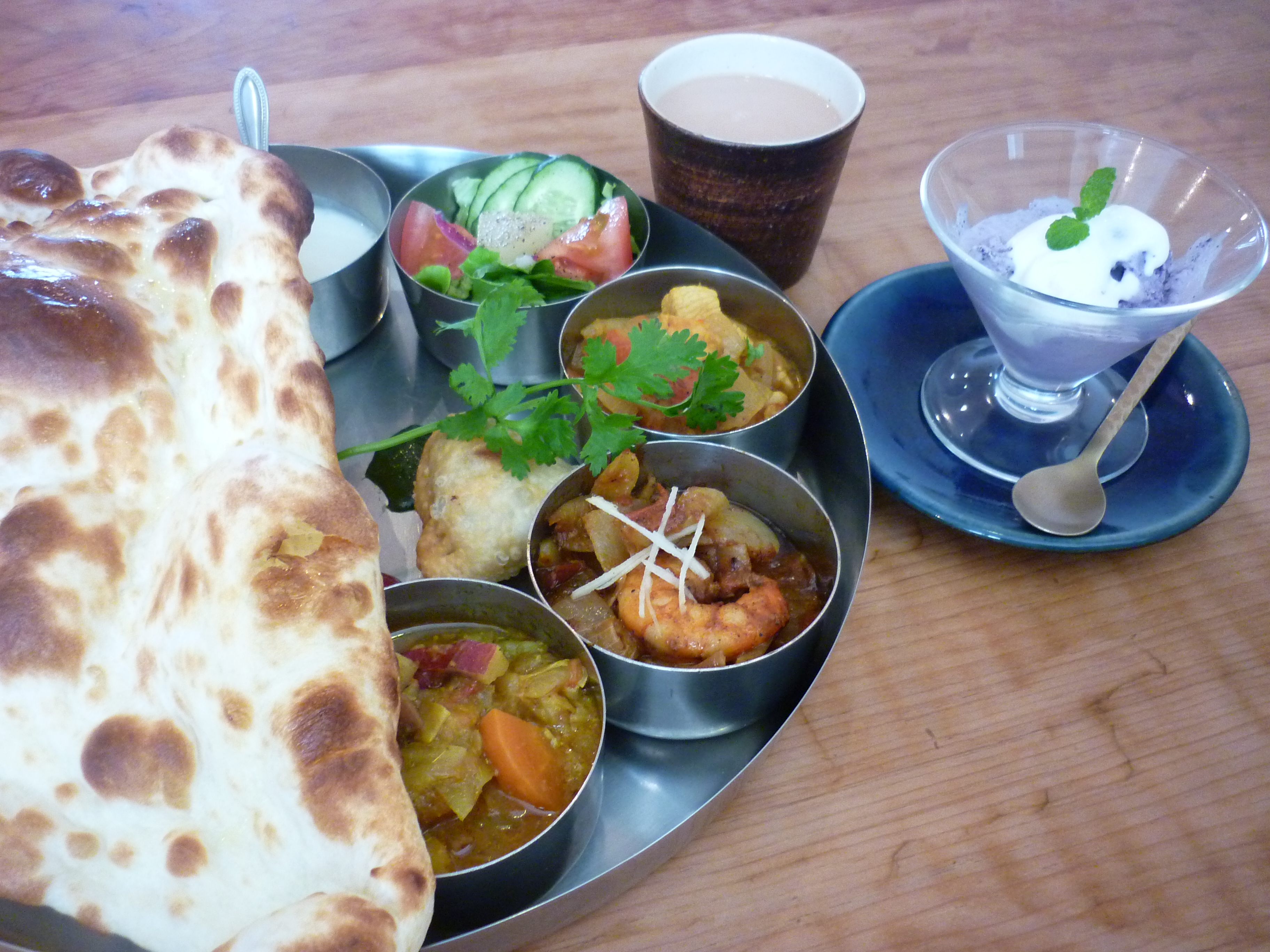 ¥2100*ポークビンダルー(インドゴア地方のカレー)チングリマライ(東インドのえびカレー)チャナマサラ*シークカバブ*フレッシュ季節のMIXやさいサラダ*たまごのアチャール*ナンまたはライス*マロンチーズタルト*オーガニックチャイまたはアイスチャイ10月よるのおすすめ