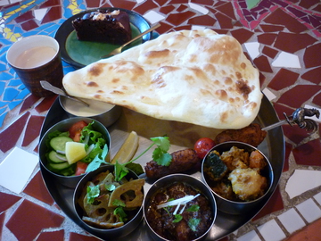 2100円*ブッタ(とうもろこしのカレー)、海老のジャルファレジー、チキンマサラ*シシカバブ*旬のMIX野菜サラダ*キャベツのアチャール*ナンまたはライス*ブルーベリーのタルト*アイスチャイまたはオーガニックチャイ5月夜のおすすめ